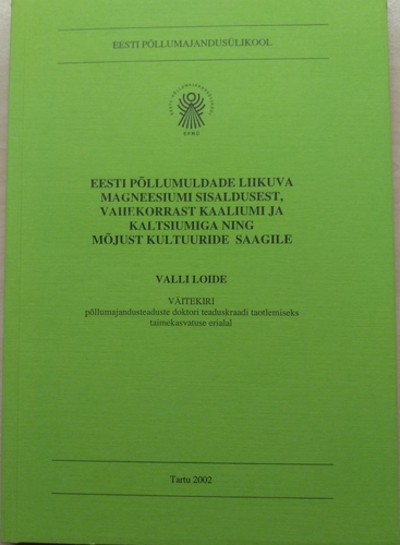 Eesti põllumuldade liikuva magneesiumi sisaldusest, vahekorrast kaaliumi ja kaltsiumiga ning mõjust kultuuride saagile